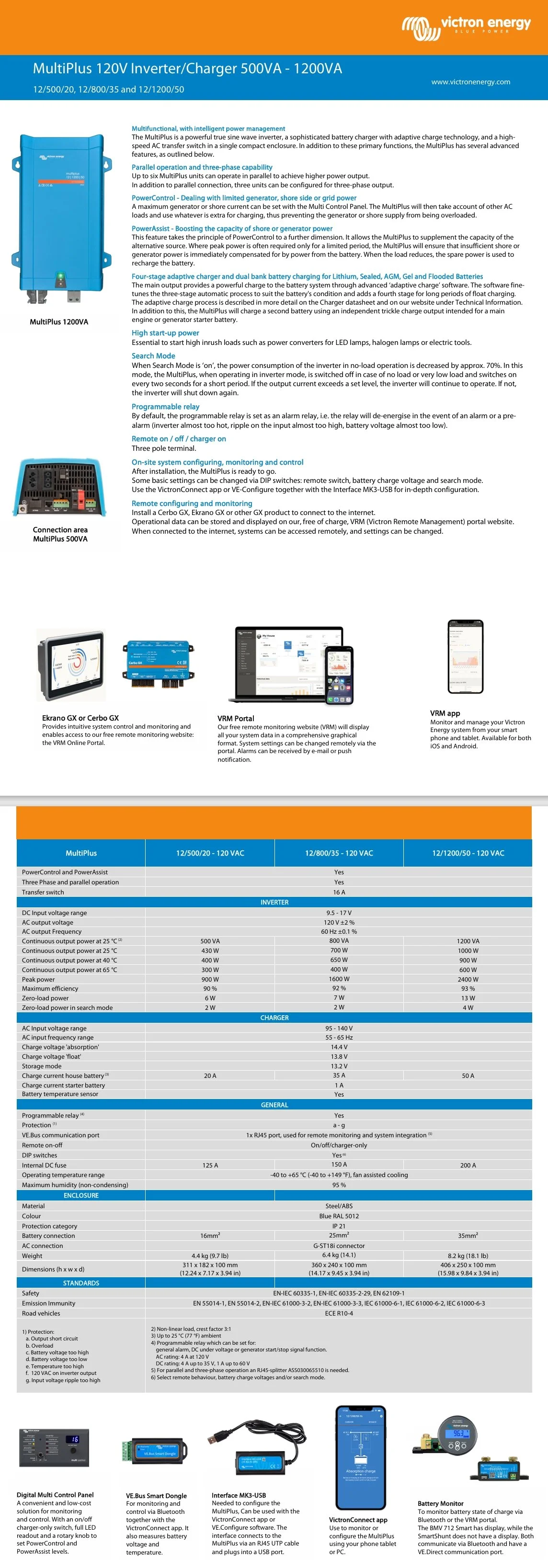 When coupled with a GX device (e.g. Cerbo GX) you can monitor and control your Multi and system or systems' locally (LAN) or remotely via the internet from anywhere in the world, using the free VRM app and free VRM portal website. Access can be from a phone, tablet, laptop or PC for multiple operating systems. There is no end to the level of control, from adjusting your Multi to auto starting a backup generator and more…"